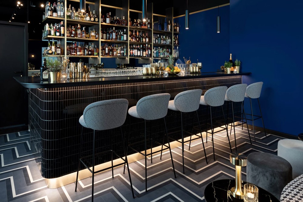 Designer Sebastian Zenker has created a scheme that sets the bar with deep blue tones dipped with gold accents and cosy lounge furniture. Famed for use of graphic elements (his logo is a monochrome zigzag pattern), Amtico’s new Wave Parquet laying pattern was an obvious choice for the floor.