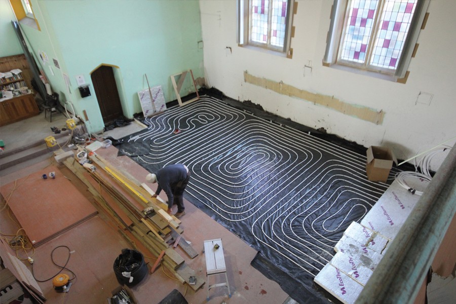 ‘The specification switches to OMNIE’s TorFloor system for areas like the kitchen, toilets, and other parts of the church. Across all of the 10 zones which are fed from four multi-port manifolds measuring up to 920mm wide, the circuits are designed for a flow temperature of 55deg C to give a return temperature of 48deg C in order to maximise the performance of the condensing boiler.