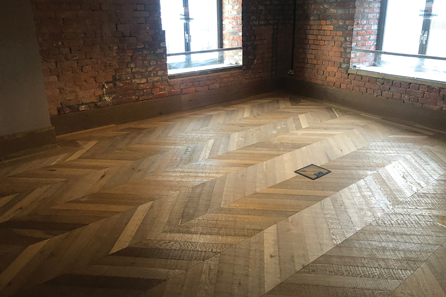 IN 2017 The Solid Wood Flooring Company says it was presented with a great opportunity when it met with the principal architects Archer Humphrey Architects to capture its requirements and vision as the architects wanted a fumed chevron band sawn board creating a ‘real unique luxury and bespoke feel to the project at The Place Aparthotel in central Manchester’.