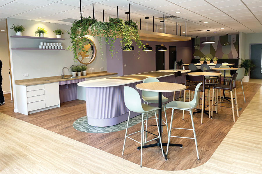 A significant part of this project was the breakout space that formed the centre of the new facility, as Abbie explained further: ‘When you first enter the building you come straight into this large open-plan breakout room, with tables and a large island in the middle. Improve International wanted this to have a ‘coffee shop’ feel to it, while tying in its branding colours.