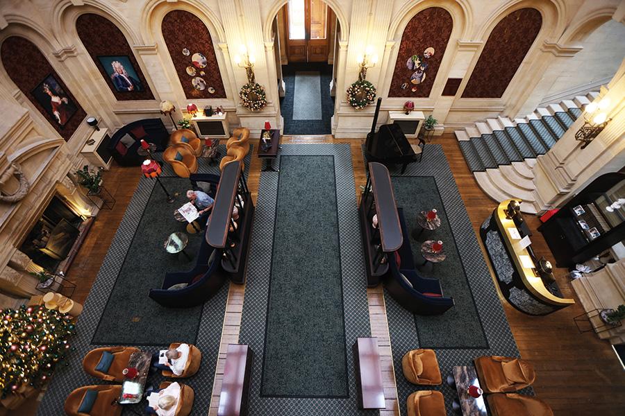 In the Renaissance palazzo-style courtyard of the old building, contractors installed sections of bespoke Newhay carpet surrounded by brass edging on top of the original wood flooring in seating areas and walkways, as well as on the staircase leading up to the first floor, where it was secured with custom-made solid-brass CAT stair-rods affixed with F Ball’s Stycco Flex ‘rapid-curing, flexible tube adhesive’.