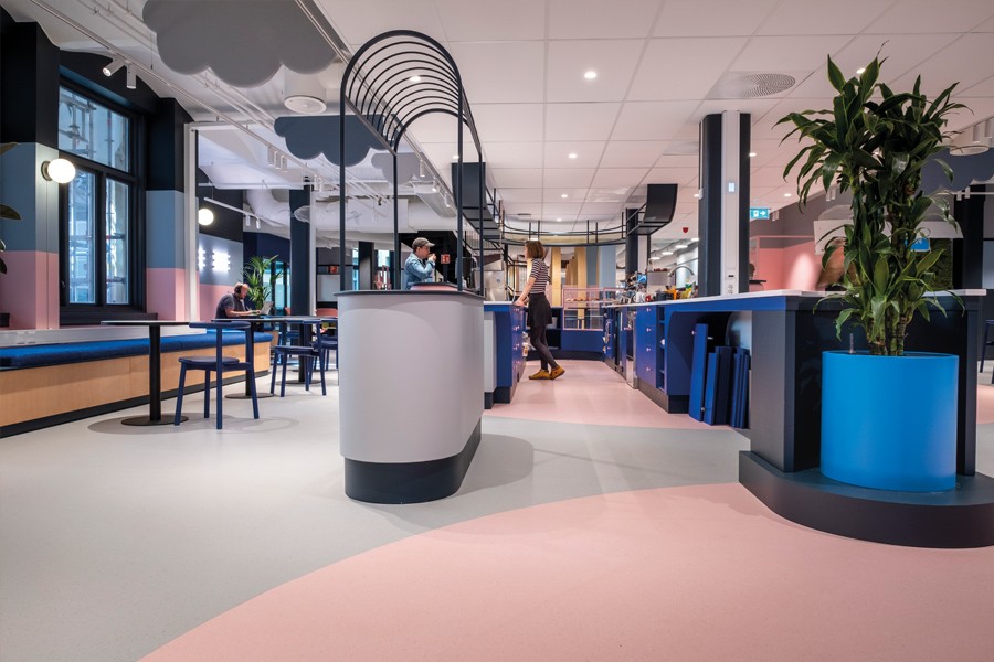 Using FINN.no’s profile and logo as a starting point, Kravik-Jørundland developed a colour and design scheme centred on blue, pink, and grey hues – and required a floorcovering with a wide range of colour availability to bring the concept to life.