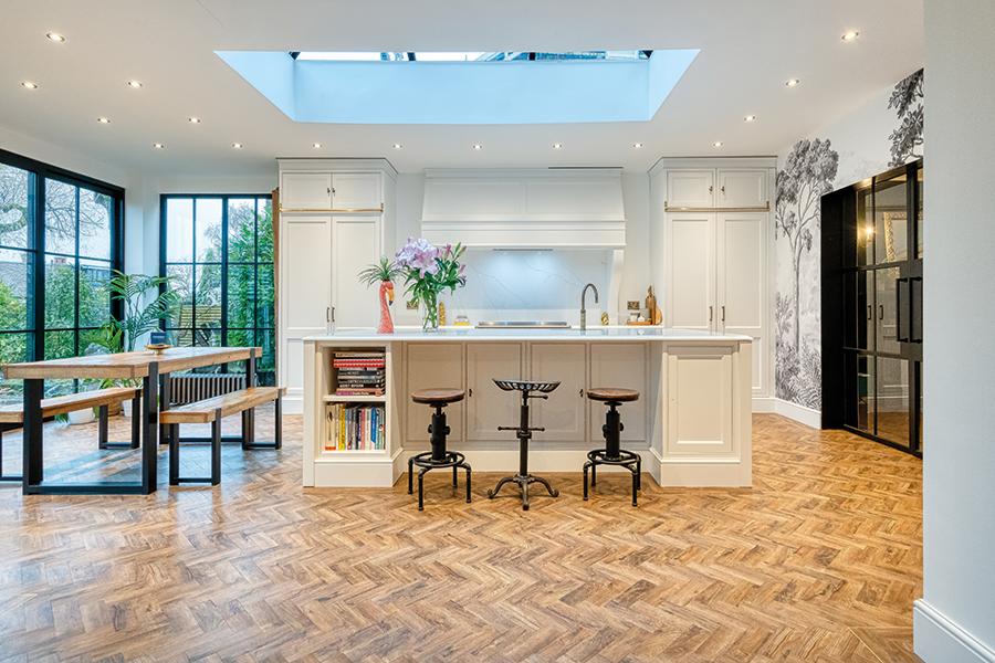 Phoenix Flooring Manchester were consulted early on in their project and completed the flooring installation. Simon Peers, owner of Phoenix Flooring took note of the interesting characteristics of each room from the skylight over the kitchen island, to the alcoves in the hallway. He recommended a double plank parquet border with a marquetry strip to finish their space. The borders are said to complement the curves of the walls and room features ensuring their flooring is unique as their home.