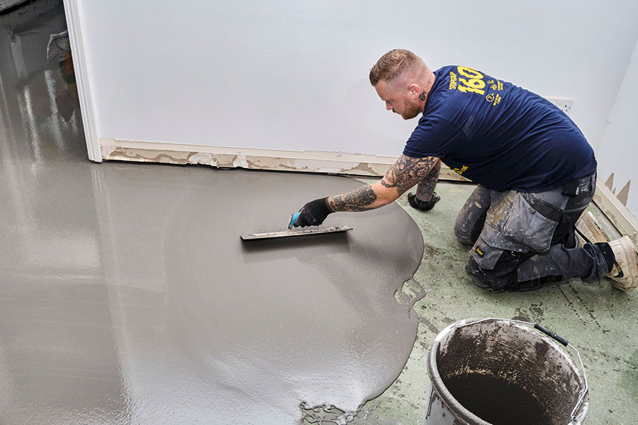 After uplifting old engineered wood floorcoverings and mechanically grinding off adhesive residues from the concrete subfloors, it was necessary to raise subfloors by 20mm so new floorcoverings would reach the level of skirting and doorframes, as well as a new fireplace installed on a slate plinth.