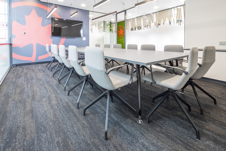 IVC Commercial’s Rudiments carpet planks in the Clay Create design were presented to Air Canada during a finishes meeting as a solution for the main desking areas of the office space.