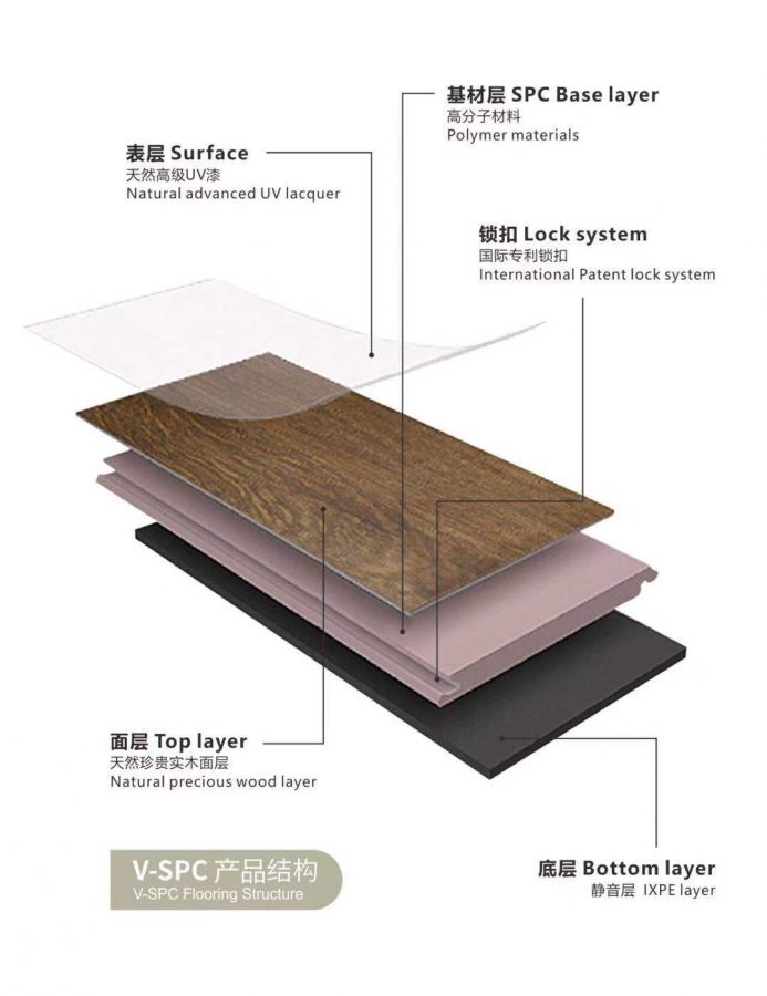 The V-SPC flooring is a new product developed on the basis of the SPC flooring. V-SPC flooring is on the base of SPC flooring to cover all kinds of wood veneer, using gluing technology and UV lacquered.