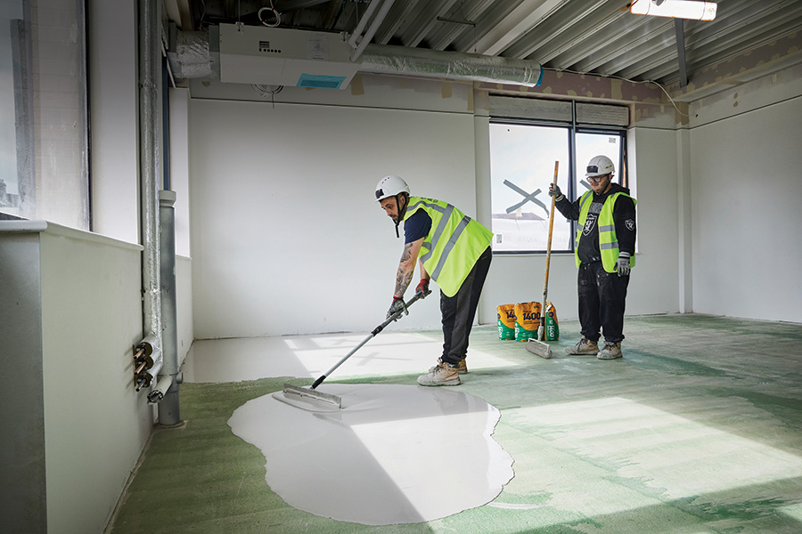 The subfloor preparation process commenced with scabbling the concrete screeds to remove laitance. Moisture tests conducted with digital hygrometers indicated subfloor moisture levels were low enough to proceed with the installation without the requirement of a moisture management solution. All areas were then primed using F Ball’s P131 general-purpose primer.