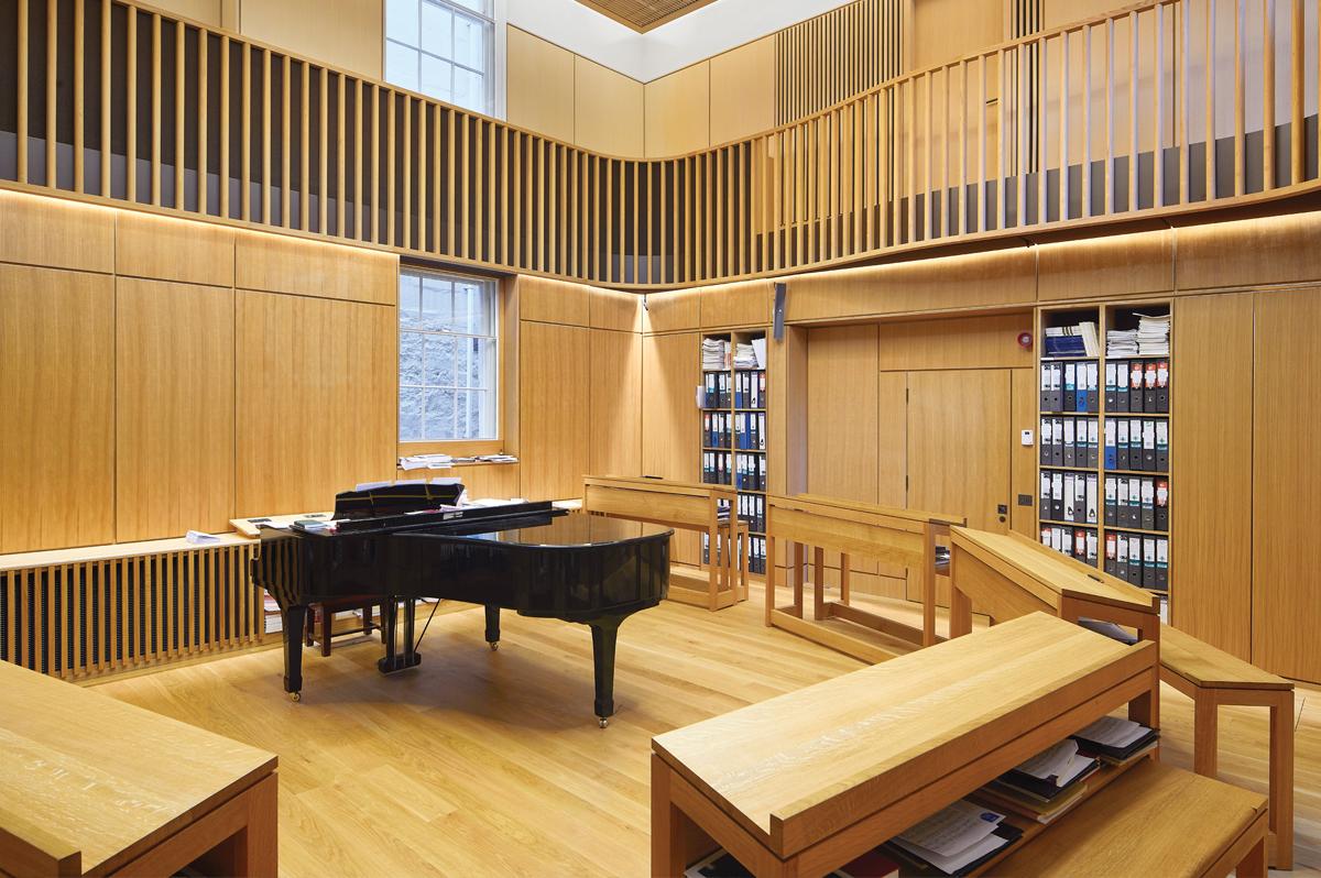 As part of reworking and improving the Abbey’s back of house facilities, FCBStudios designed the Song School, a new, timber-lined choir practice room where up to 60 singers can rehearse. The oak-panelled room features Junckers solid 20.5mm Oak Harmony plank flooring installed by Moran Floors. The solid oak is said to further enhance the acoustics in the room, an important consideration to the abbey.
