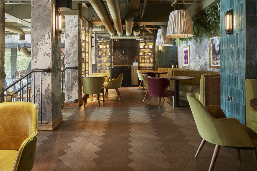 With semi-private areas available in differing sizes across various floors, the floorboards are understated enough to ensure the primary focus continues to be the high-quality food and drink on offer. The space features a wide range of interiors, including traditional lampshades and contemporary pendant lights, vibrant wall tiles, gold accents and foliage, as well as mixed and matched chairs in various colourways and materials, such as velvet and worn leather.