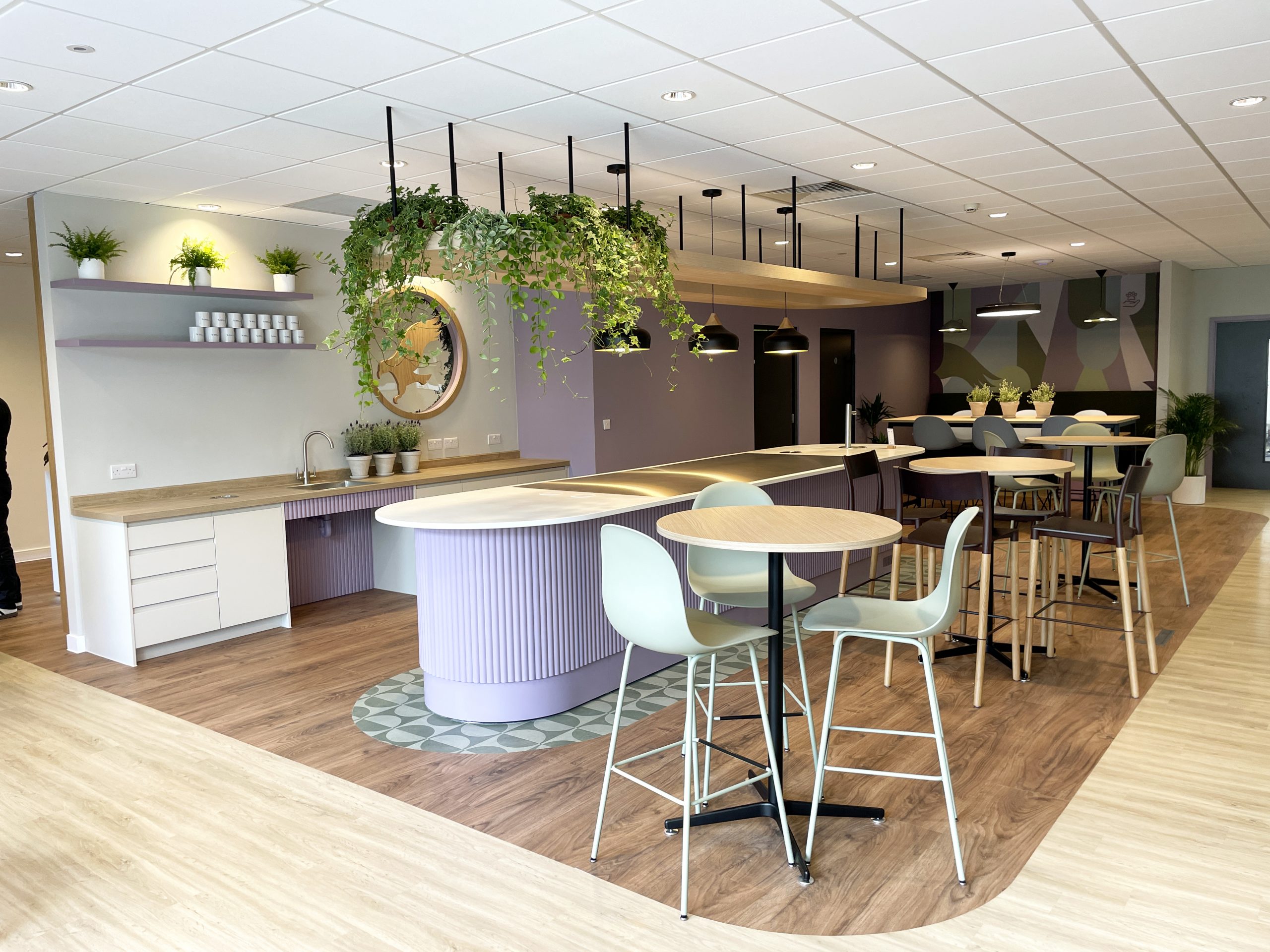 A significant part of this project was the breakout space that formed the centre of the new facility, as Abbie explained further: “When you first enter the building you come straight into this large open-plan breakout room, with tables and a large island in the middle. Improve International wanted this to have a ‘coffee shop’ feel to it, whilst tying in its branding colours.