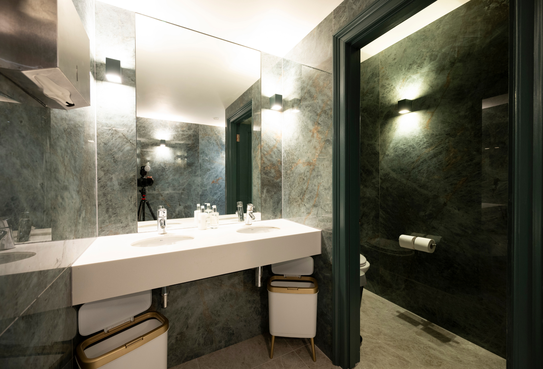 To the walls of the Ladies in the DIVA Galaxy colourway expansive, large format porcelain slabs have been installed in impressive 120/278 dimensions, delivering a near seamless surface. In this design, hints of blue and green combine behind starbursts of bronze to create a luxurious lustre in its highly polished finish. In this instance we chose BAL Micromax 3 ECO in the Smoke shade to work in harmony with the Galaxy design, creating clean and coordinated lines.