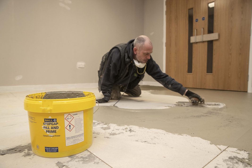 F. Ball’s Stopgap Fill and Prime and Styccobond F41 have helped to create a professional flooring finish over both wood and metal raised access panels as part of a refurbishment to create new office space for a government service in Liverpool.