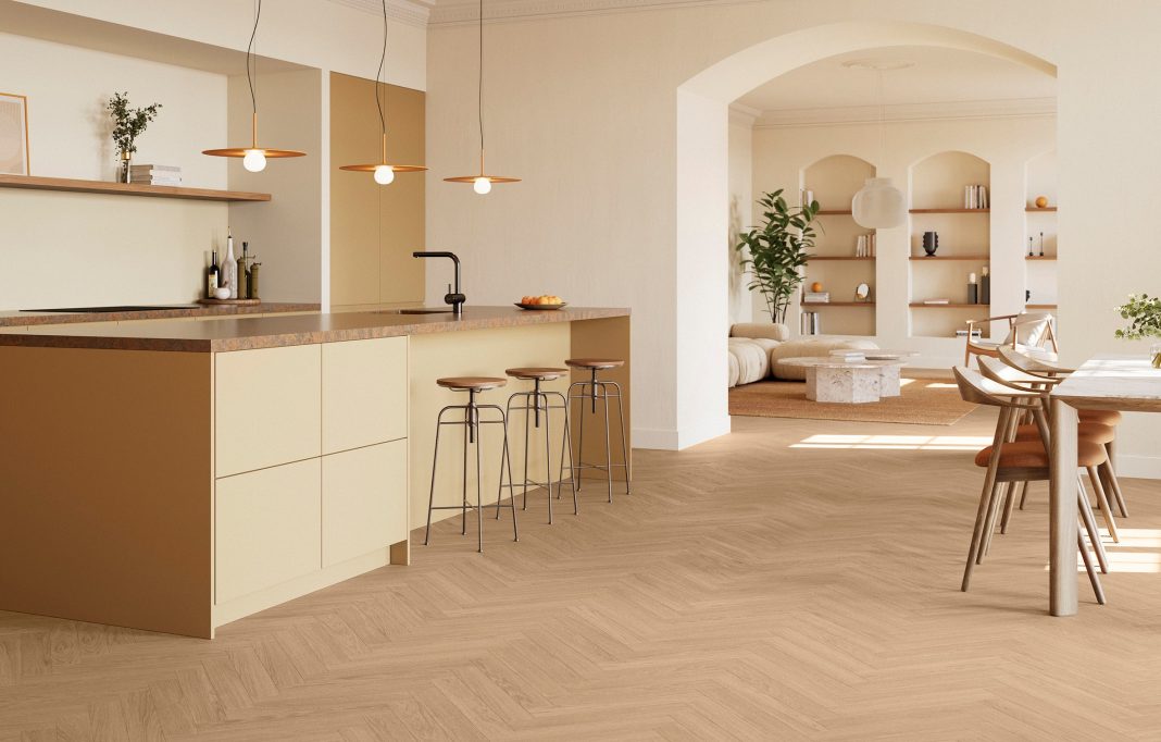 The 100% water-resistant Ocean+ and Chateau+ are premium quality laminate floors for all kinds of people, lifestyles and interiors. With the classic plank format of Ocean+ and the elegant herringbone of Chateau+, customers are sure to find the right stunning wood design for their home with the promise of excellent performance (Class 33) in whichever they choose.