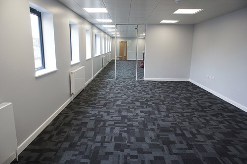 The patterned tufted loop pile carpet tile was chosen in the Volcanic colourway – a black and charcoal mix – and provides a Class 33 wear-rating for heavy traffic.