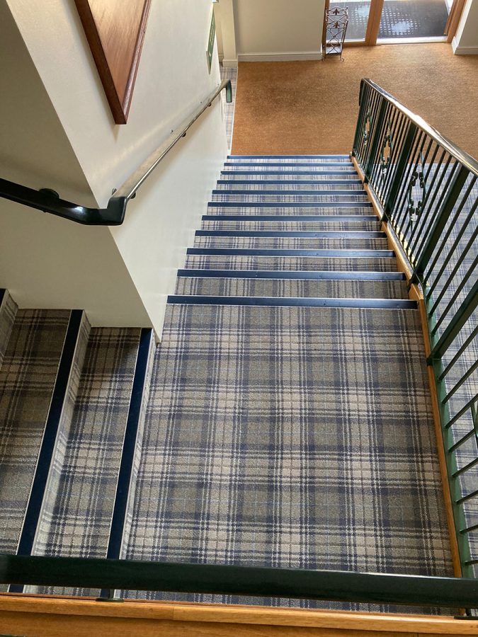 Stair nosings were drilled and countersunk before dispatch and ‘pips’ were sent to conceal the screws. Mechanically fixing the stair nosings ensures a sturdy fit and prevents rocking, stretching the lifespan of the nosing.