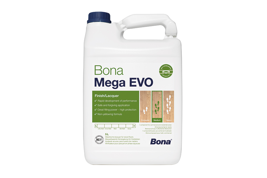 Bona Mega EVO is the next evolution of Bona Mega, which was first introduced in 1996 and offered an industry-first oxygen crosslinking technology and, at the time, was reportedly considered a top choice among flooring contractors for use as a one-component topcoat for wood floors in environments requiring medium to light commercial wear-resistance.