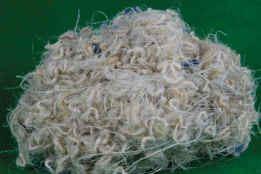 Says Simon: ‘They were launching our MONARCH, a lovely felt rubber retail underlay made entirely from recycled material, to their members. And it all starts off from the lovely wool rich fibres in the accompanying photograph – taken from bales of carpet offcuts that used to go to landfill.’