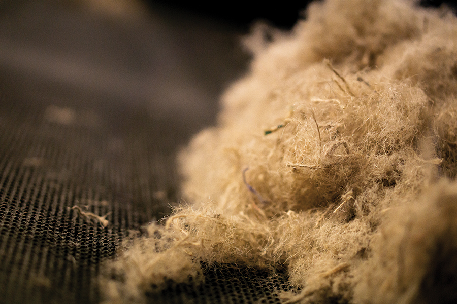 At the front end of the factory arrive bales of carpet offcuts from local carpet manufacturers such as Penthouse Carpets and Brockway Carpets and hessian sacks from the UK’s mass of artisan coffee roasters. These are then ready for fibre recycling on two huge production lines. The first was built in 2012 and the second opened last year.
