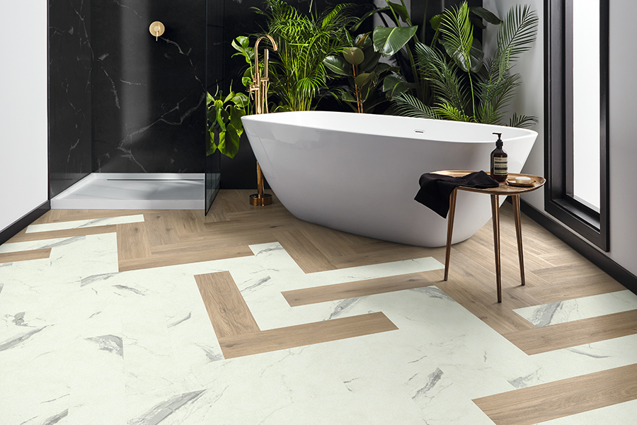 With a consistent tile thickness across each range, stone and wood designs can easily be combined in bespoke patterns. For example, marble effect tiles can be mixed with an oak design, or polished concrete used alongside ash. With colourways available in a choice of formats and sizes, a seamless look can be achieved across changing subfloor conditions or different patterns used to introduce individuality to adjoining rooms.