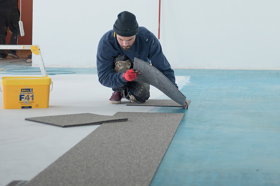 F Ball and Co’s Styccobond F41 carpet tile tackifier reportedly provides a permanently tacky film, which is said to prevent ‘looselay’ carpet tiles from moving laterally under normal traffic but allows for easy removal and replacement where needed.