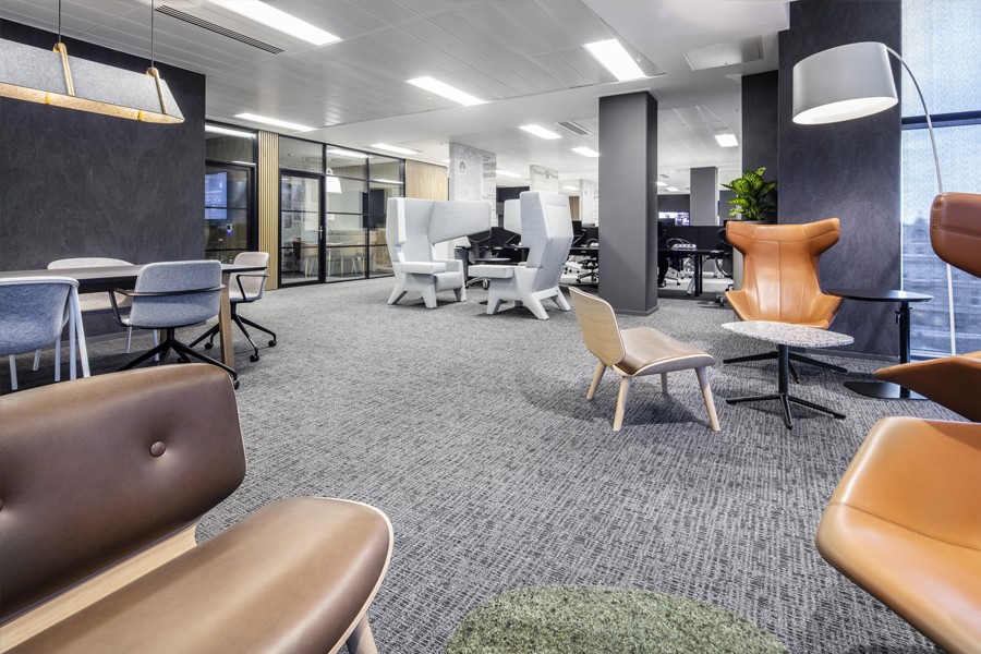 With a design that draws inspiration from EY’s brand, Wellwood Leslie created a floorplan that reflects the angles of the company’s logo and which gives the open-plan space multiple layers, simultaneously identifying areas. Mixing between LVTs installed on Flex Pro underlay and carpet tiles has also helped improve acoustics within the space.
