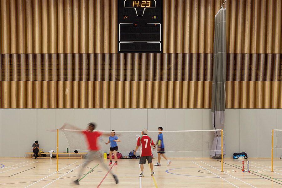 The new building is fossil fuel-free and rated BREEAM Outstanding with extensive use of natural and sustainable materials, natural lighting and ventilation, air source heat pumps and heat recovery, including a bio-solar roof which reduces demand from the national grid by over 20%. The centre includes a swimming pool, a fitness suite, multi-activity studios, an eight-court sports hall, squash courts, climbing and bouldering facilities, a ski simulator and teaching facilities.