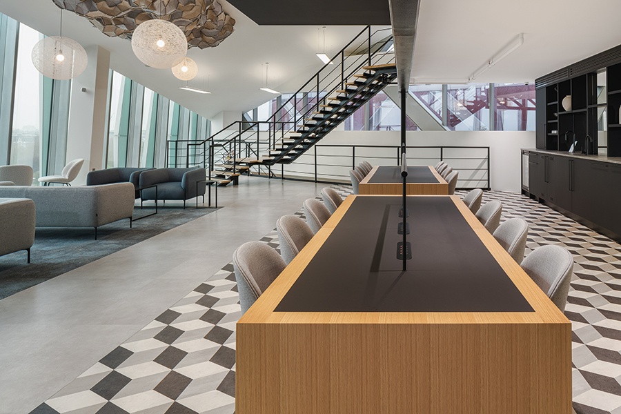 ‘Sitting alongside this working zone, Quebec from the Karndean LooseLay range creates a restful seating area and walkway to the board room at the rear of the mezzanine. Opting for extra-large scale tiles (1,000mm x 1,000mm) in a block pattern has resulted in a seamless poured concrete effect that’s highly realistic.