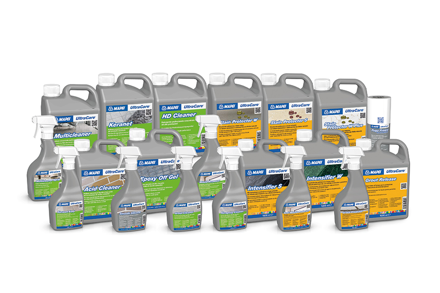 MAPEI’s range of UltraCare cleaners includes a series of treatments individually designed for daily cleaning, deep cleaning and surface renovation. The range includes options for use on all types of tile and stone, suitable for professional and end-user application.