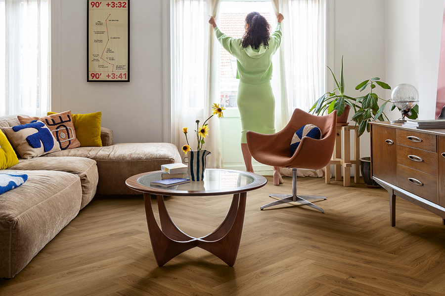 It adds: ‘The floor’s integrated underlay is another highlight, aiding the speed of installation by eliminating separate underlay as well as improving comfort and reducing noise. The high-quality PE construction also adds support to Alpha Vinyl’s Uniclic system for reliable and lasting fitting time after time. It’s the same for Alpha Vinyl Ciro herringbone floors with Unizip, Quick-Step’s system for easy click installation with a single plank. Wasteful A&B planks and complex fitting can now be a thing of the past.‘