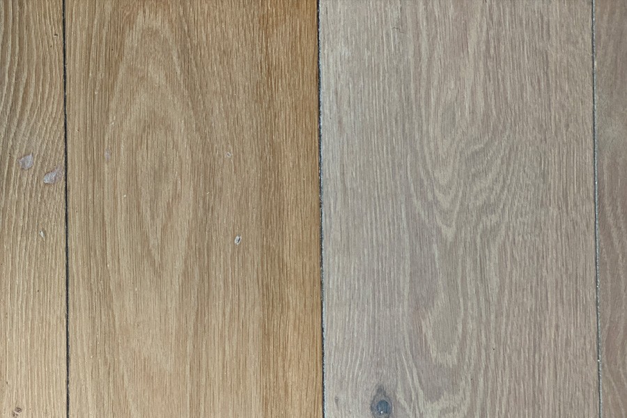 The first step was to sand the floor. The floorlayer carefully processed the floorboards using a Hummel floor-sander. The fine residues of sanding dust were then thoroughly vacuumed off. After the wooden floor had been sanded and prepared, the so-called ‘water popping’ process followed. This opened the pores of the wood and raised the fibres.