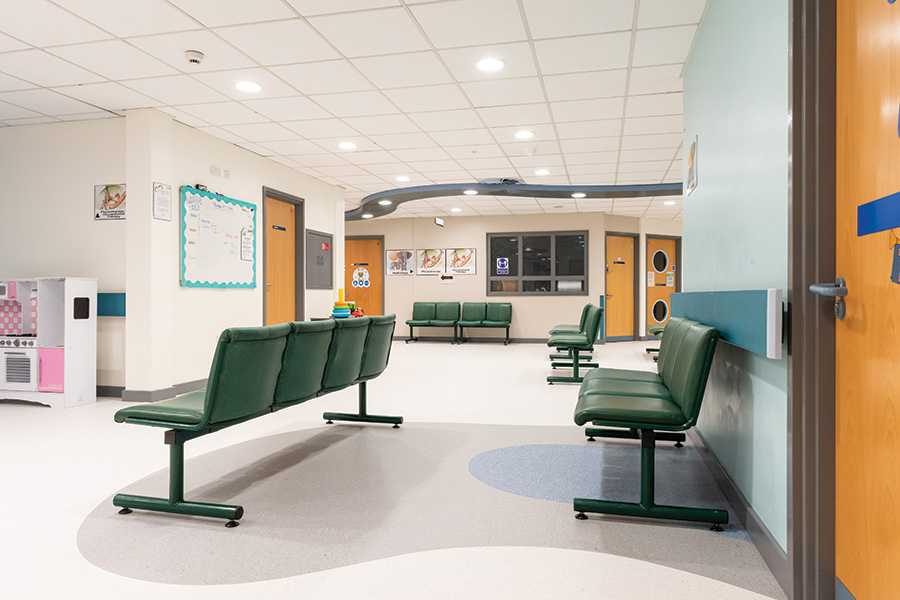Derbyshire Flooring Contractors installed an eye-catching bespoke vinyl flooring design in the waiting area and connecting corridors of the children’s outpatient ward at Royal Derby Hospital, a total area of 800sq m.