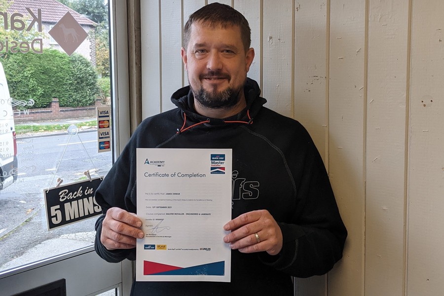 James attended the Academy for Excellence in Flooring’s intensive three-day Master Installer Laminate & Wood programme. The course sees a mix of classroom knowledge and practical training and assessments, with a pass or fail outcome, and qualified Master Installers are provided with a wide range of business enhancements on completion.